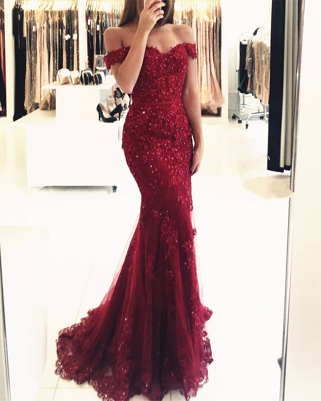 Vestidos de fiesta de tul con encaje y cuentas, estilo sirena, color burdeos, hombros descubiertos