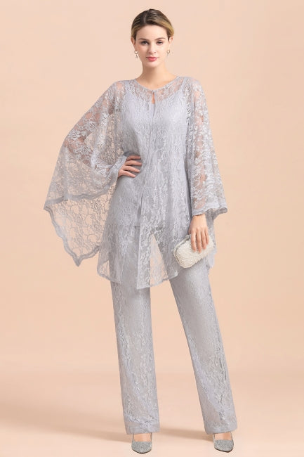 Elegante mono plateado con apliques de escote en V para madre de la novia con envolturas de encaje