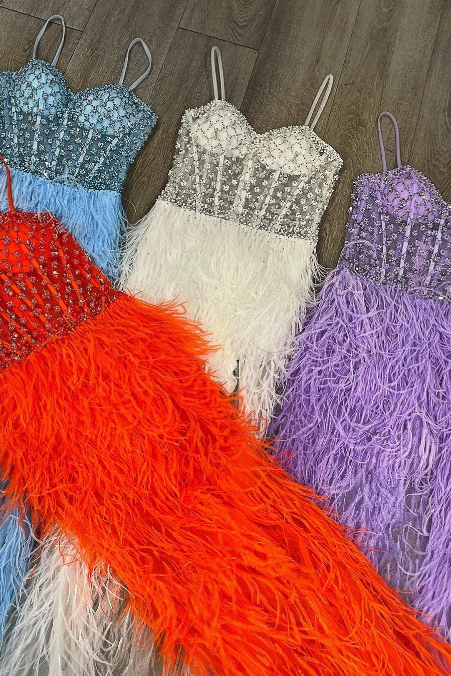 Vestido de fiesta con tirantes finos, plumas y abertura