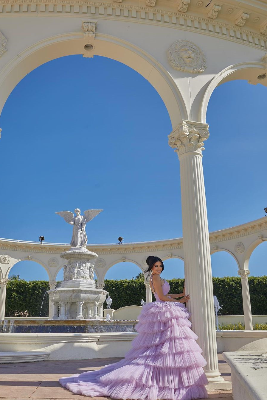 Vestido de fiesta princesa de corte A, color lila, con tirantes y volantes, sin mangas