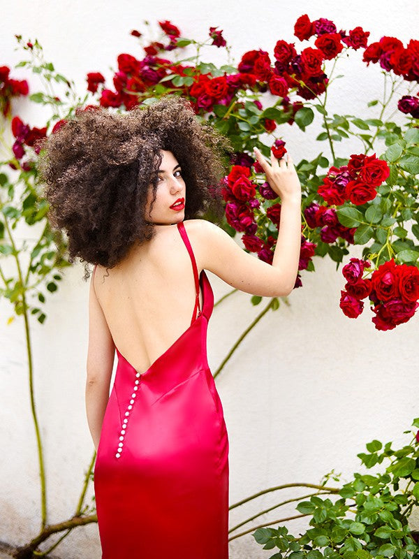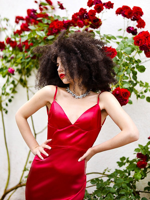 Vestidos de fiesta de satén tipo seda, con escote en V, sin mangas y volantes, corte tubo/columna
