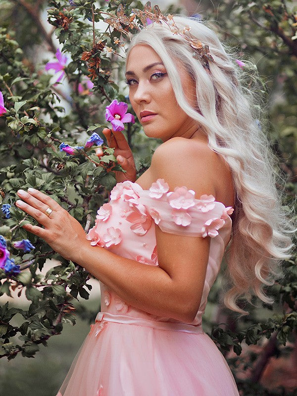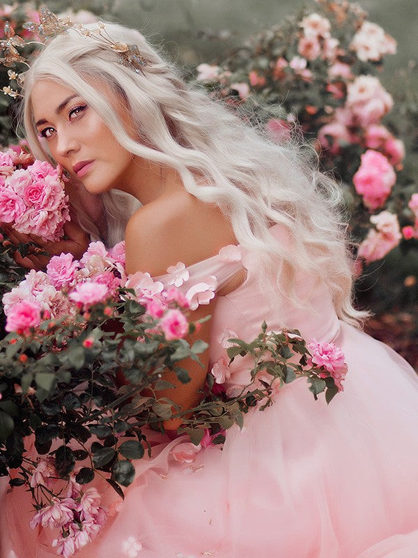 A-Line/Elegant Off-the-Shoulder Applique Tulle Sleeveless Floor-Length Prom Dresses