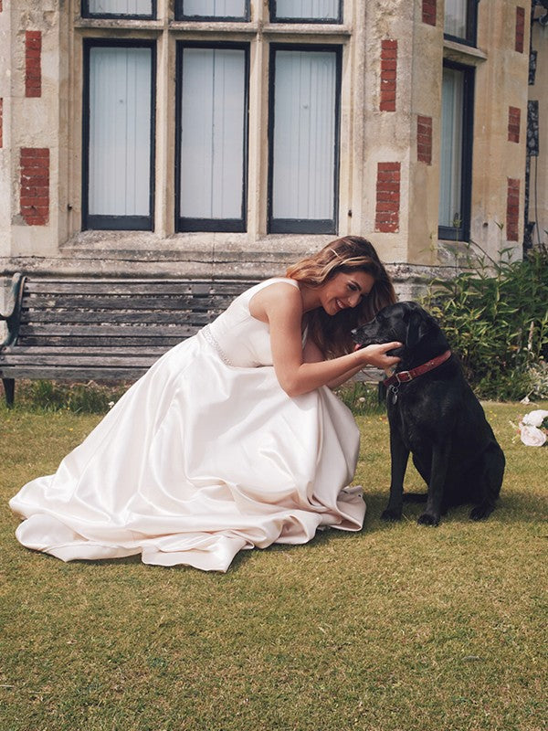 A-Line/Elegant Satin Beading V-neck Sleeveless Prom Dresses