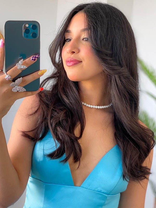 Hold the measuring tape at your hollow while a friend pulls it down to the length you want your dress.