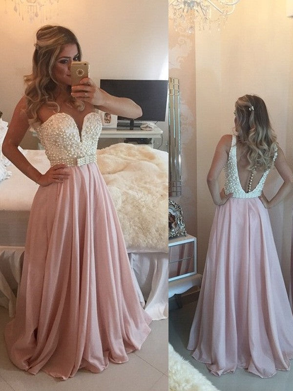 A-Line/Elegant Sweetheart Sleeveless Pearls Floor-Length Chiffon Prom Dresses