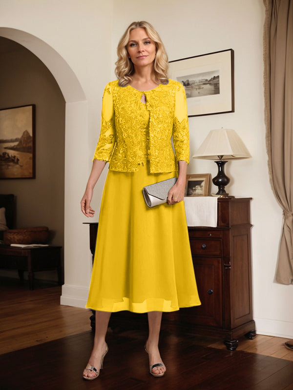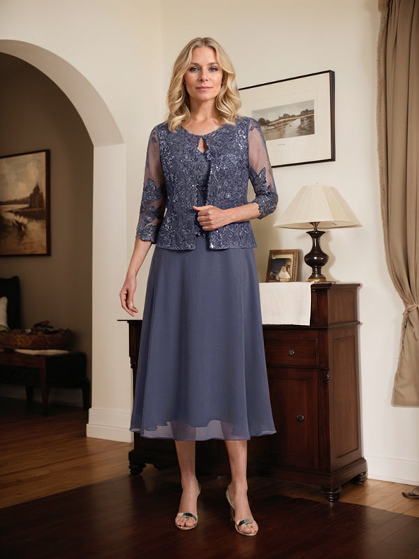 A-line Scoop Tea-Length Lace Chiffon Mother of the Bride Dress With Sequins