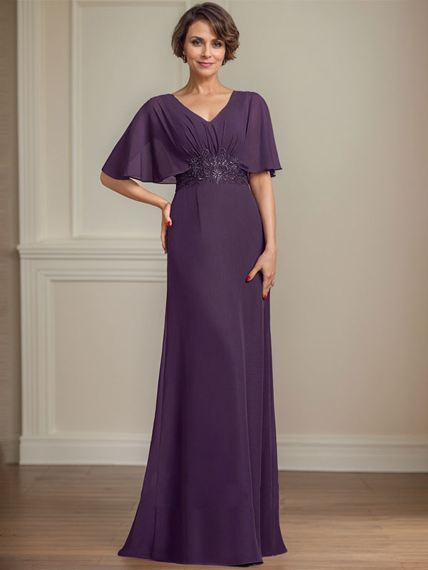 A-line V-Neck Floor-Length Chiffon Mother of the Bride Dress With Pleated Sequins Appliques Lace