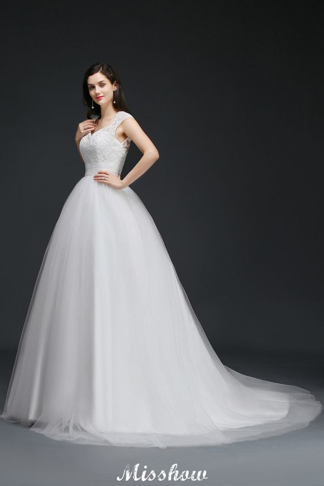 Ball Gown V-Neck Tulle Elegant Wedding Dresses with Buttons
