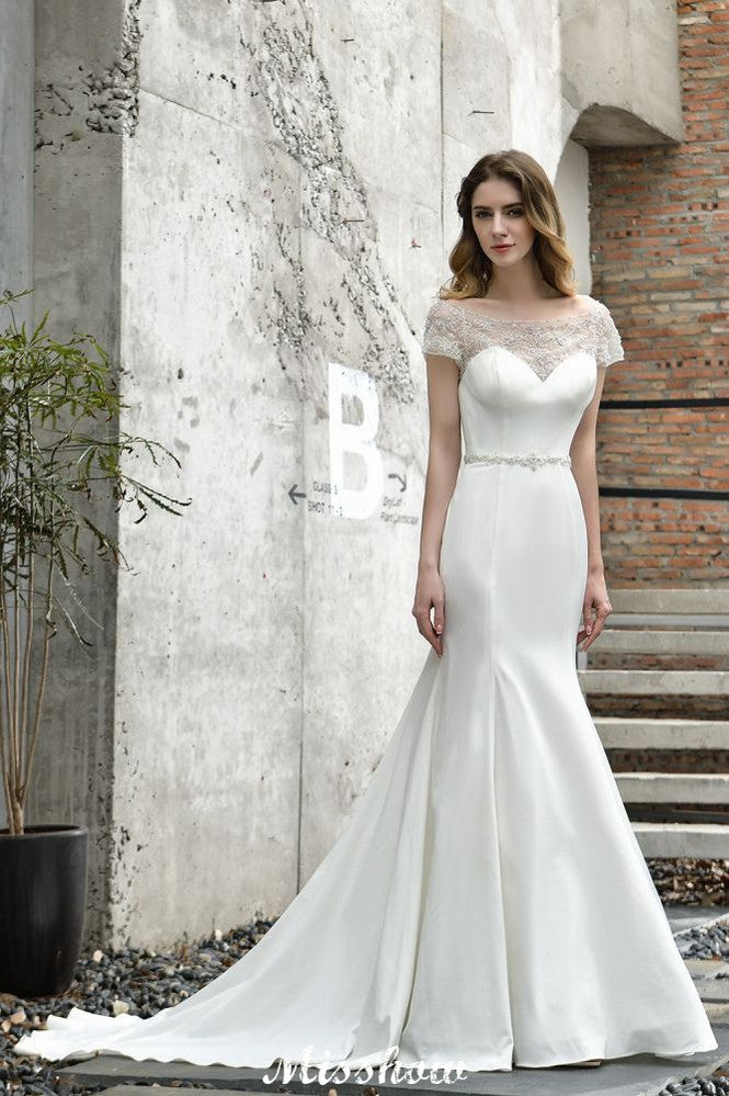 Bateau Short Sleeve Slim Mermaid Wedding Gown Satin Bridal Gown Sweep/Trump Train
