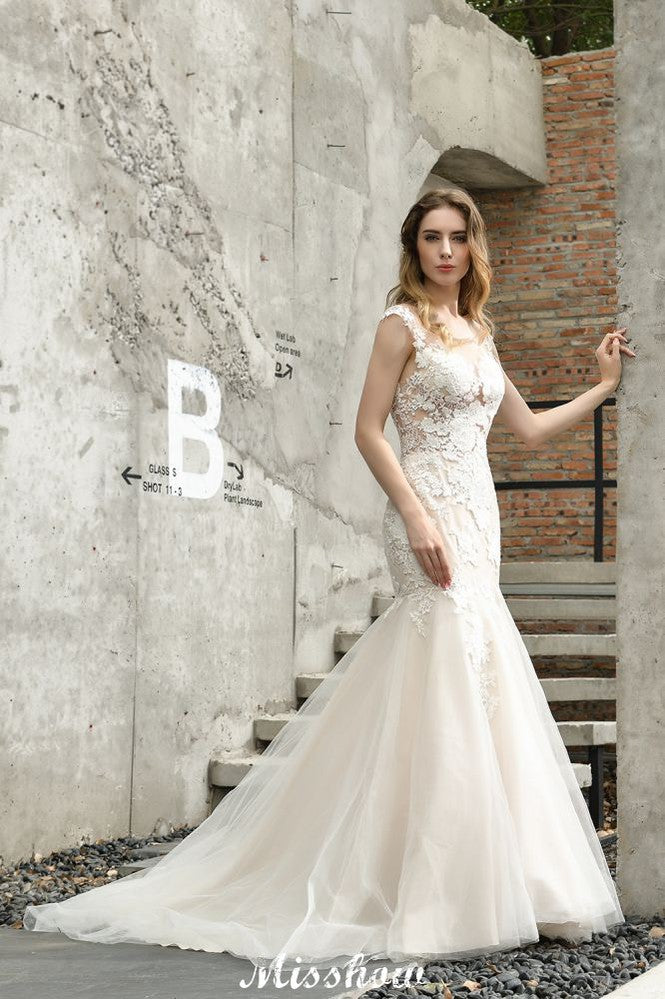 Cap Sleeves Lace Mermaid Wedding Dress White/Ivory Floral Garden Bridal Gown