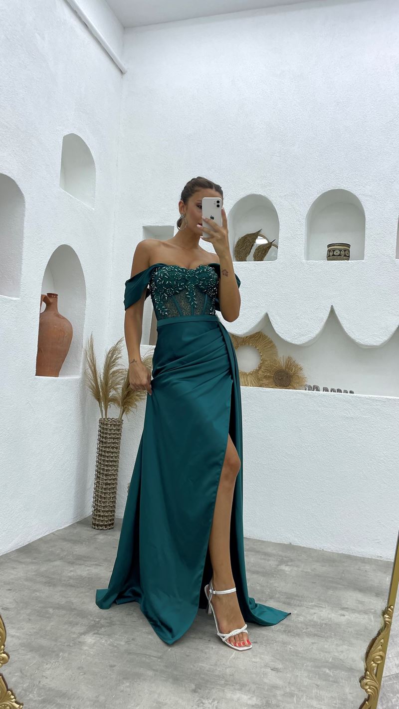 Turn heads with this deluxe floor length mermaid prom dress. The off-the-shoulder form flatters the figure with a sleek satin fabric and a dramatic split. The perfect combination of classic beauty and modern style.