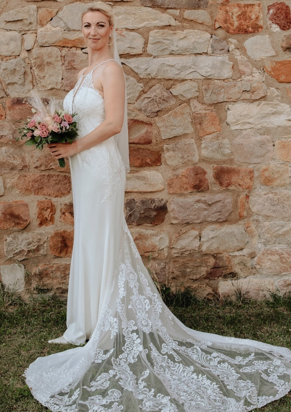 This wedding dress exudes elegance with its long mermaid silhouette. sleeveless design. and intricate lace detailing. The striking backless design adds a touch of sensuality. while the train brings the perfect amount of glamour. Perfect for a sophisticated and romantic bride looking to make a statement on her special day.
