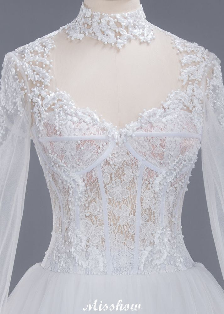 Elegant Tulle Lace Ball Gown High Neck Long Sleeves Floor Length Wedding Dress