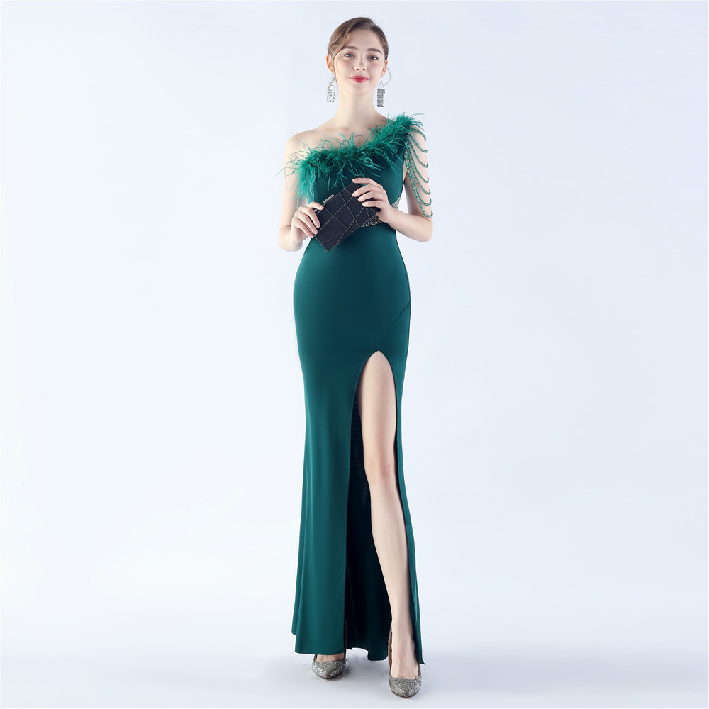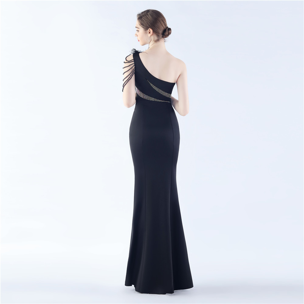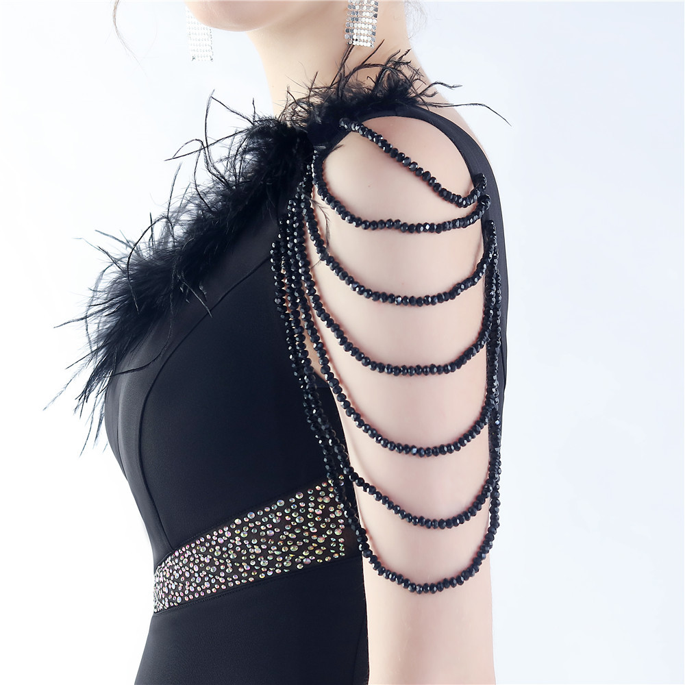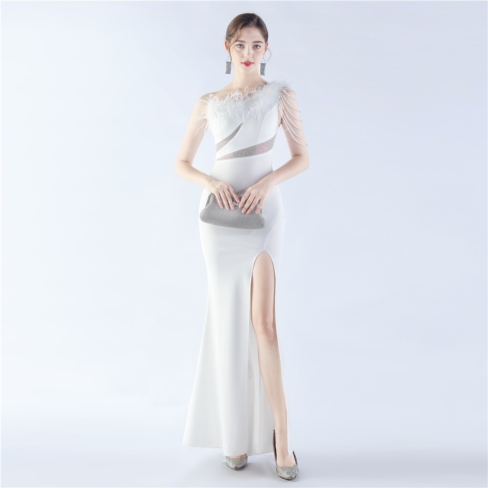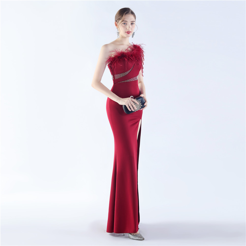 Evening Dress Craft Rhinestone Handmade Beaded Ostrich Feather Diagonal Collar One Shoulder Dress