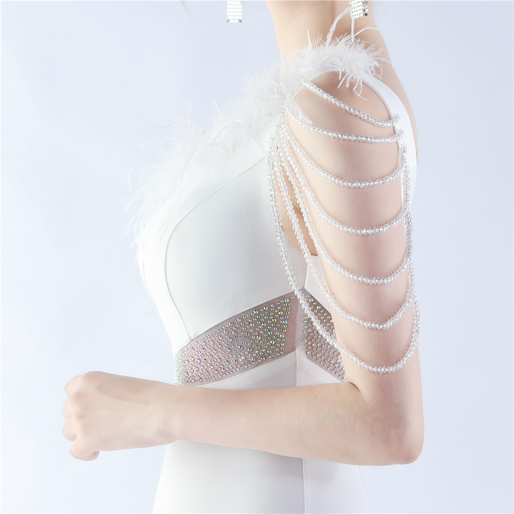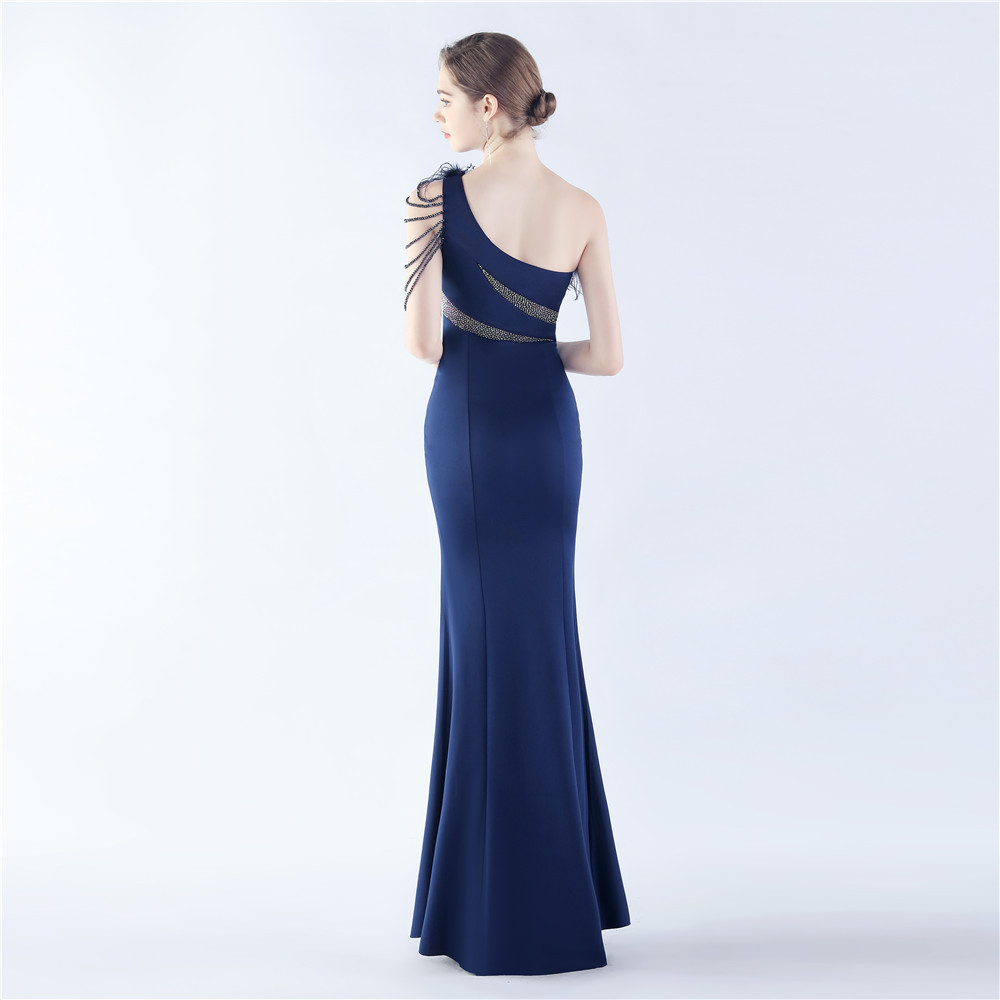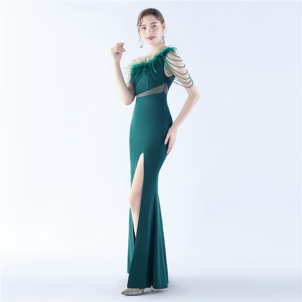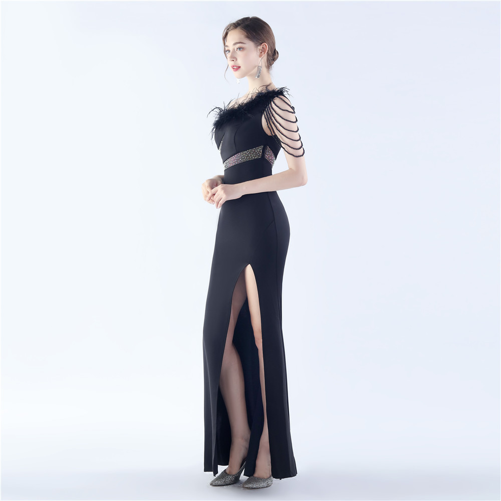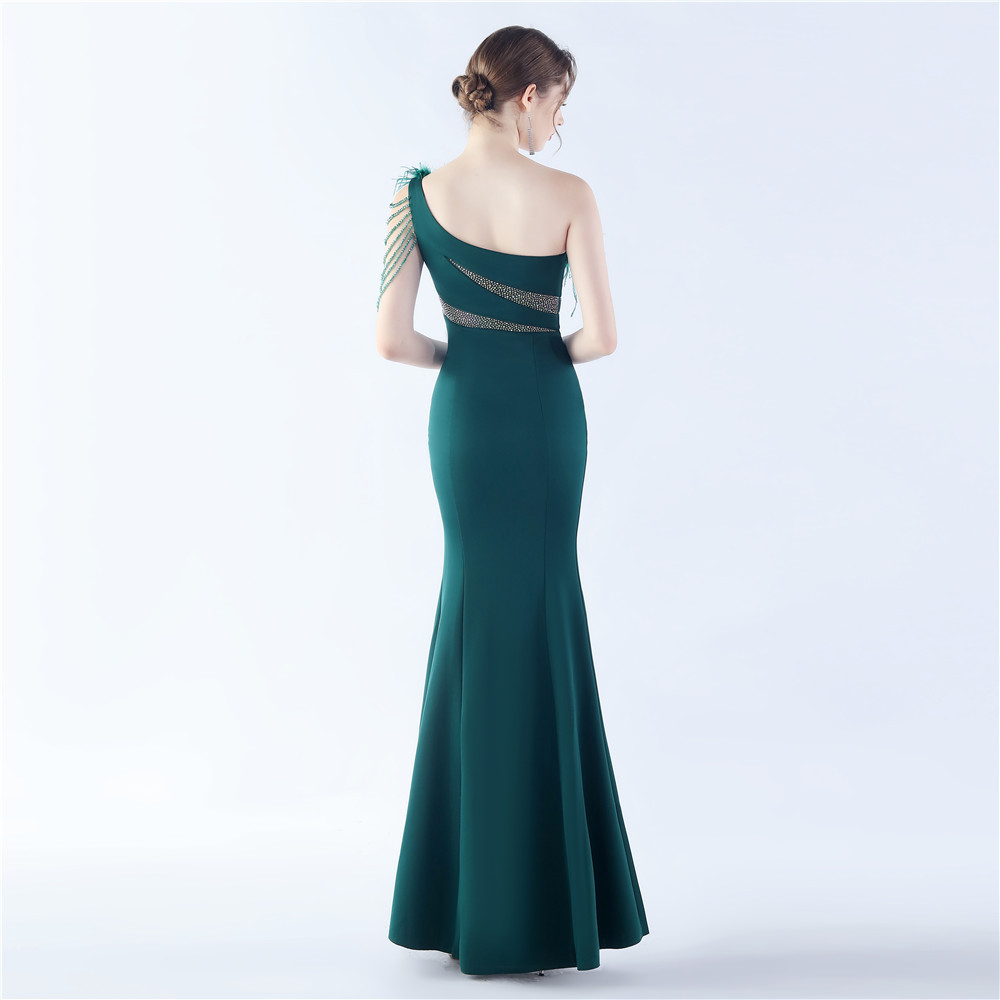 Evening Dress Craft Rhinestone Handmade Beaded Ostrich Feather Diagonal Collar One Shoulder Dress