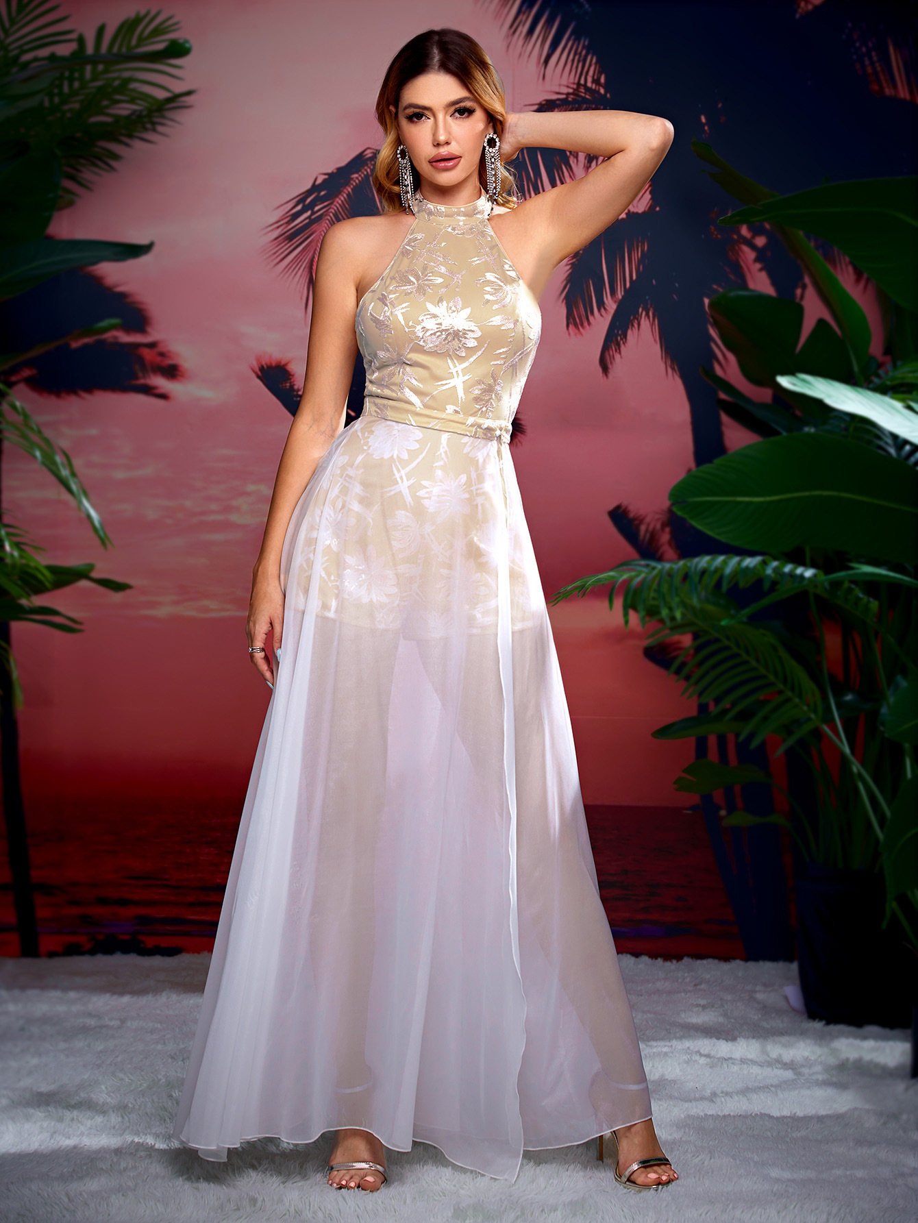 Fairy Girl Lace Halter Backless Waist Slit Evening Dress