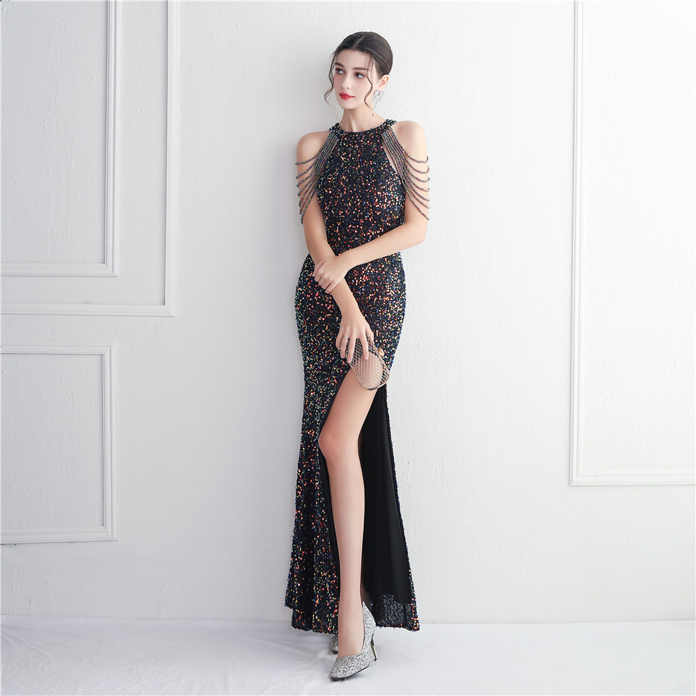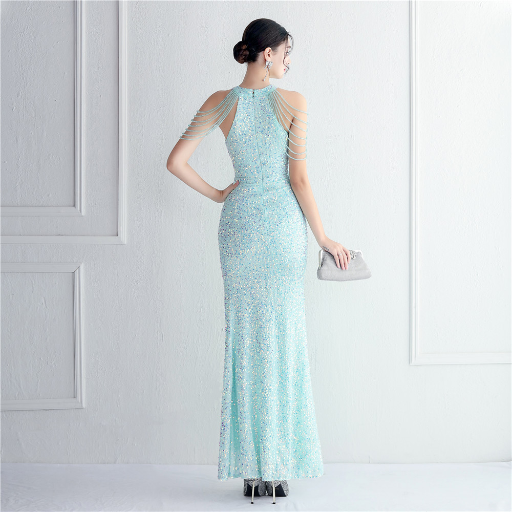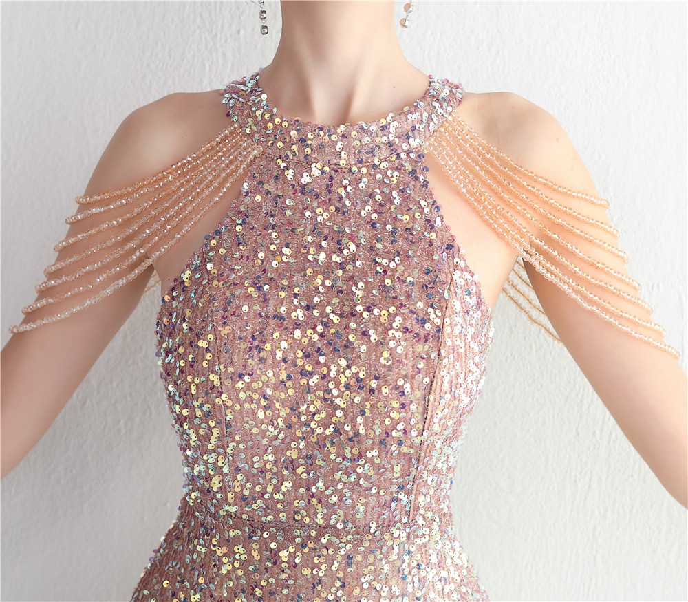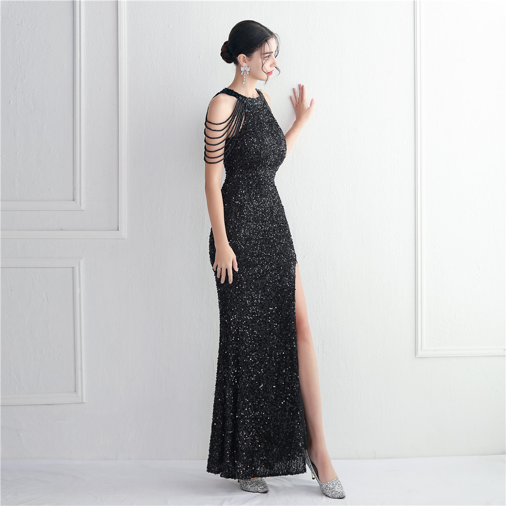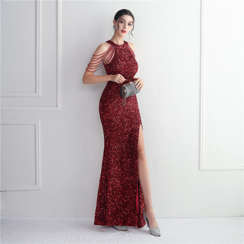 Heavy Industry Micro Glass Bead Craft Beaded Cocktail Evening Dress Elegant Long Halter Split Sequ