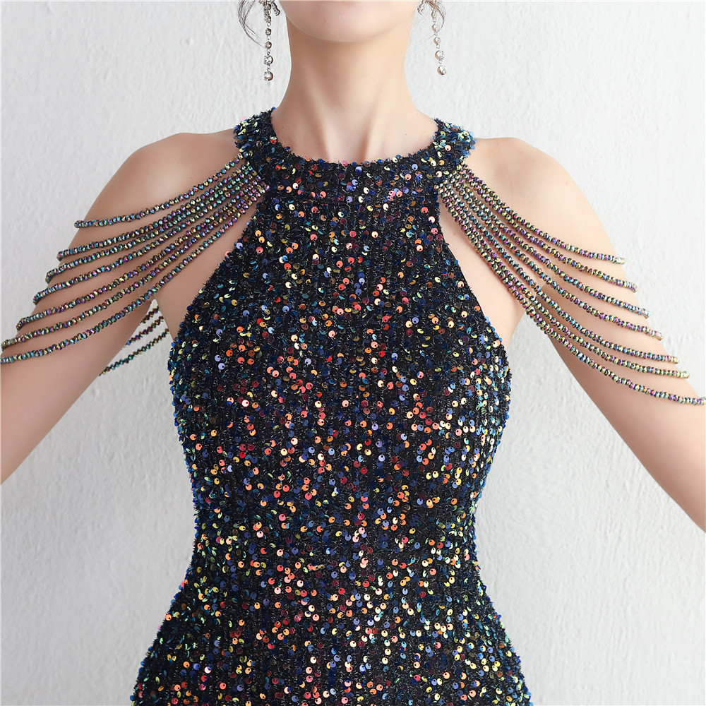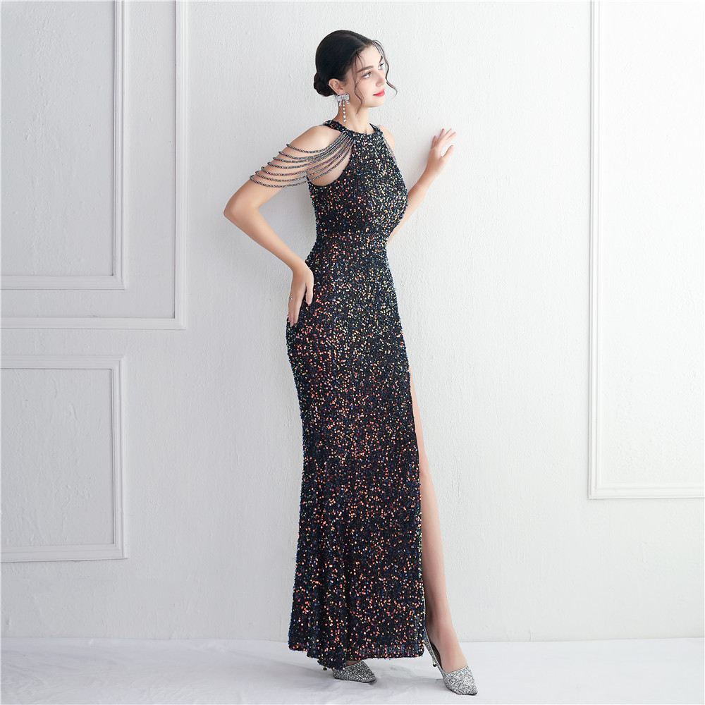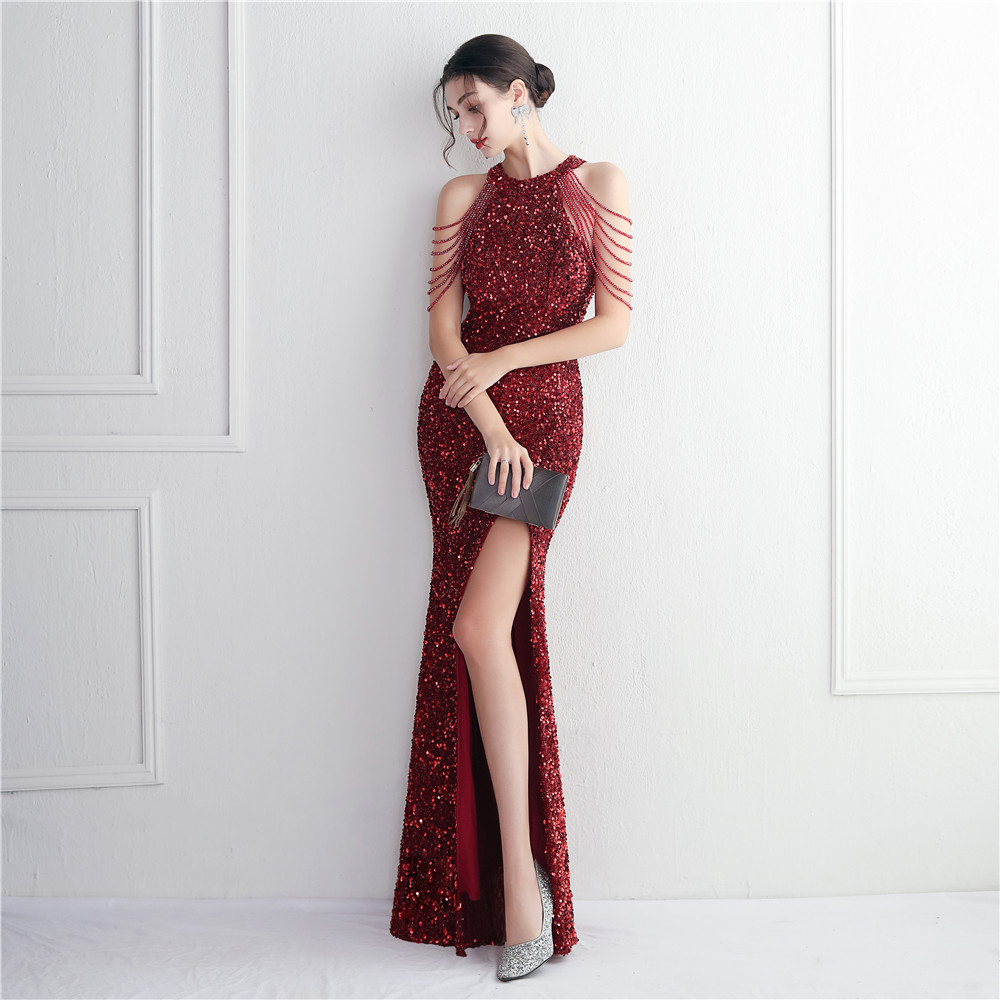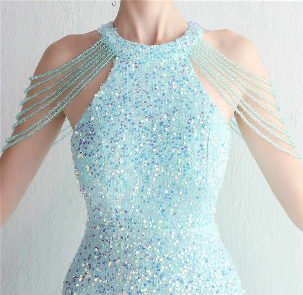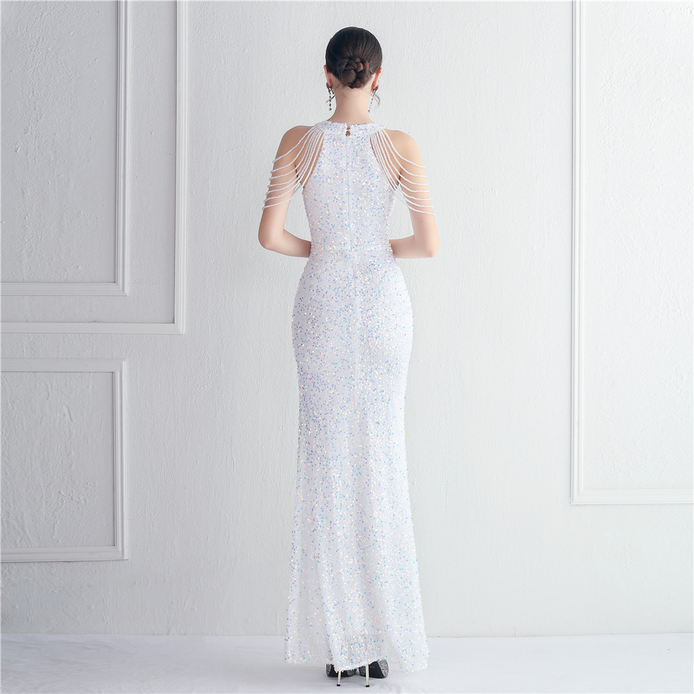 Heavy Industry Micro Glass Bead Craft Beaded Cocktail Evening Dress Elegant Long Halter Split Sequ