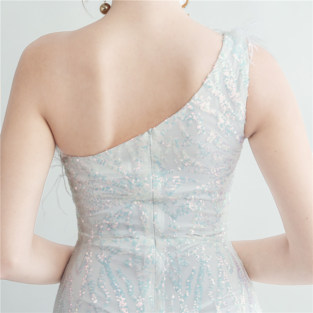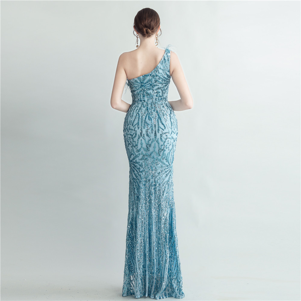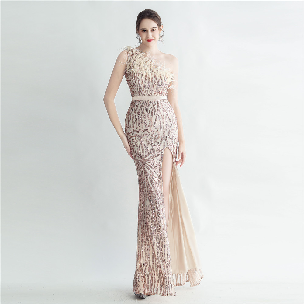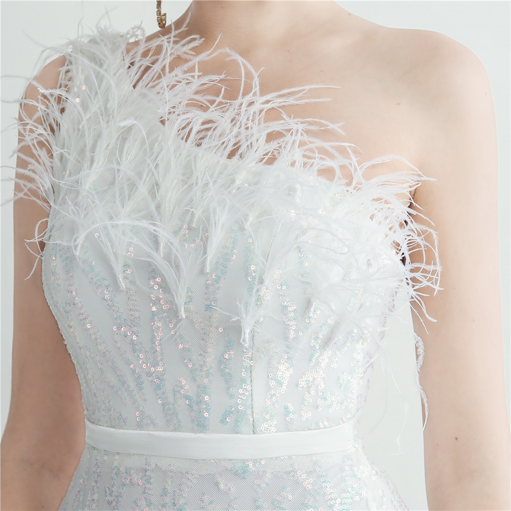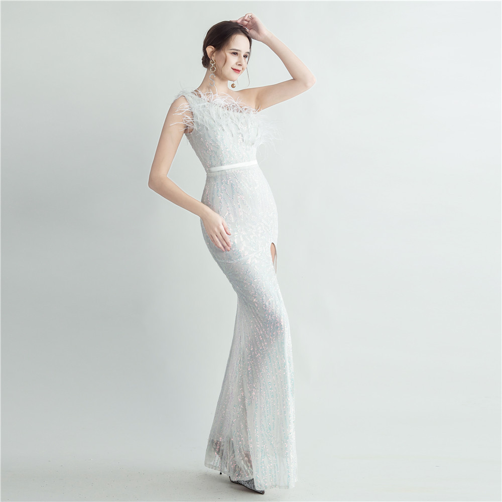 Heavy Industry Ostrich Hair Craft Bundle Hair Evening Dress with Oblique Shoulder Slit