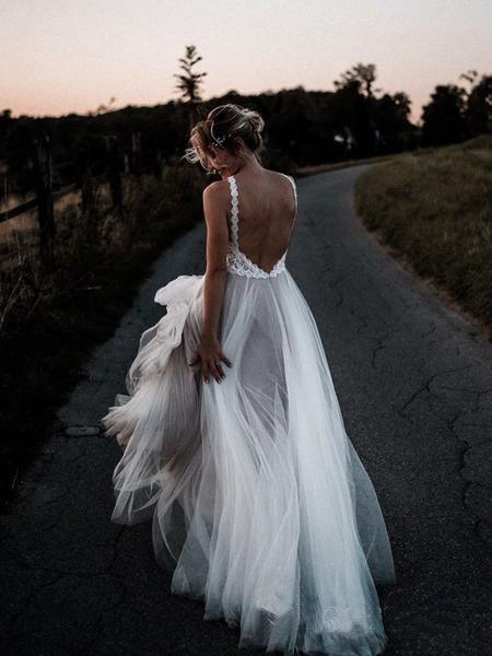 Lace Bodice Tulle Skirt Backless Bridal Gown Minimalist Wedding Dresses