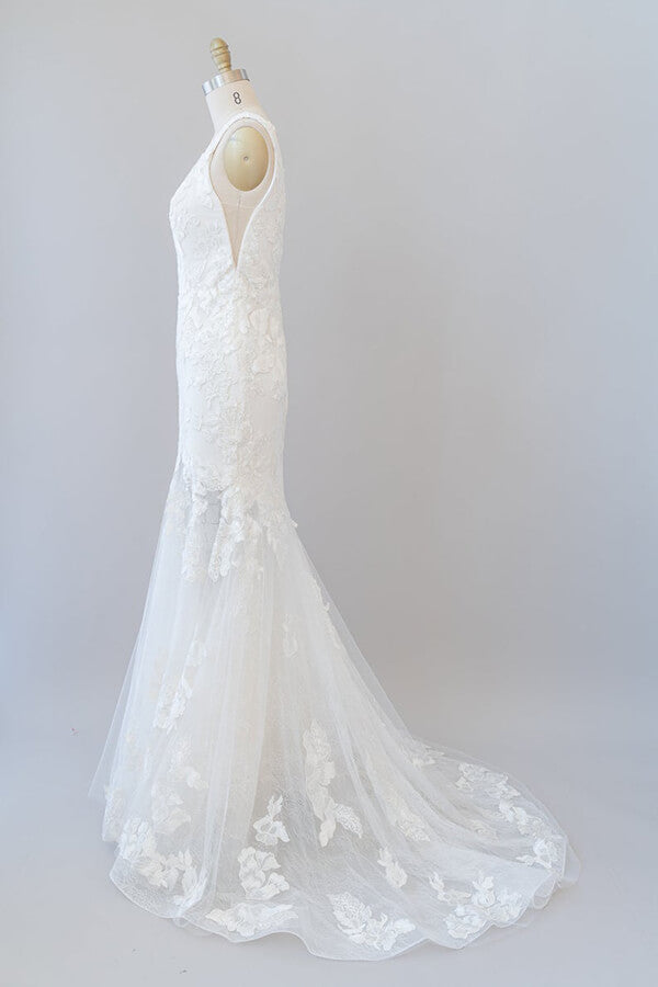 Long Mermaid V-neck Appliques Tulle Lace Wedding Dress