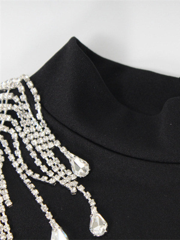 Long Sleeves Skinny Back Cross Split-Side Tasseled High Neck Evening Dresses Midi Dresses