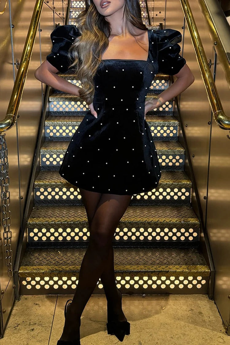 Indulge in elegance with our black velvet pearl dress. a stunning addition to your wardrobe. Featuring a cinched waist for a flattering fit and adorned with delicate pearls- this dress exudes sophistication and charm. The plush velvet fabric adds a luxurious touch. making it the perfect choice for evening events or special occasions.
