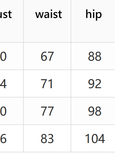 | Hips | 35 ½ | 89 | 36 ½ | 92 | 37 ½ | 94 | 38 ½ | 97 | 39 ½ | 100 | 41 | 104 | 42 ½ | 107 | 44 ½ | 112 | 46 ¾ | 118 | 49 | 124 | 51 ¼ | 130 | 53 ½ | 135 | 56 ½ | 143 | 59 ½ | 150 | 62 ½ | 158 | 66 ½ | 168 |