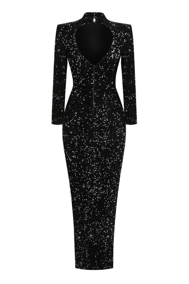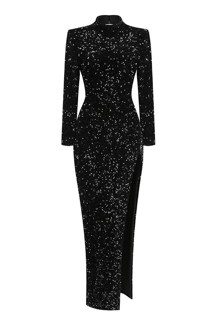 Shine bright in dazzling sequin dresses. Featuring an elegant half high neck and long sleeves. this sexy cut-out dress showcases a thigh slit. allowing a peek of your legs. while the cutout at the back adds allure. With a zip-fastening for easy wear. this glamorous embellished maxi dress sparkles with sequins. making it a sexy and glamorous choice. Whether you're seeking a luxury velvet dress with slit for eveningwear. our boutique has you covered. Elevate your outfit and exude confidence with this stunning formal dress designed for women. Keep it a classic all black look by adding pump heels.