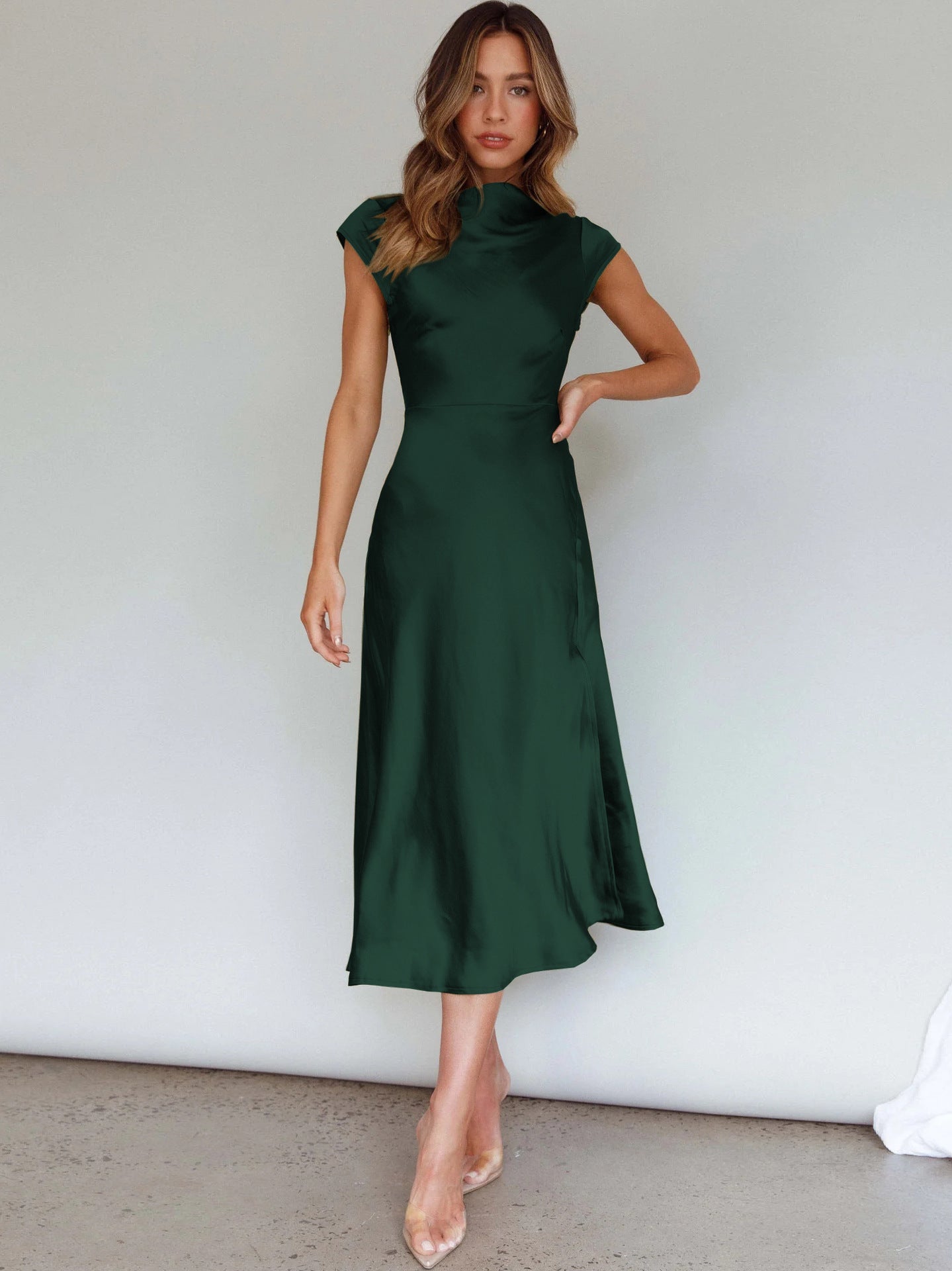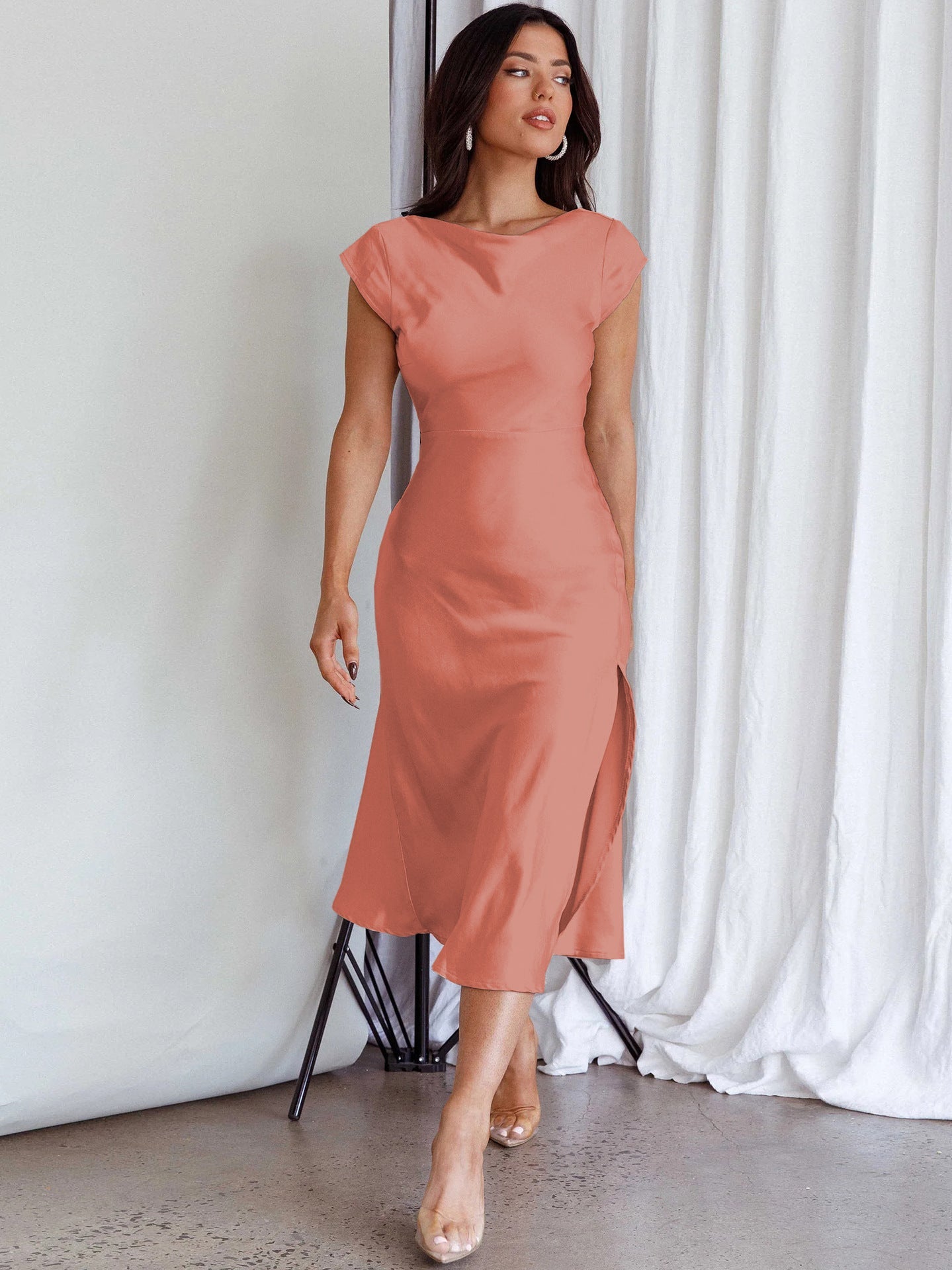 Summer Women High Fork Elegant Dress Sexy Slimming Backless Pure Satin Evening Dress