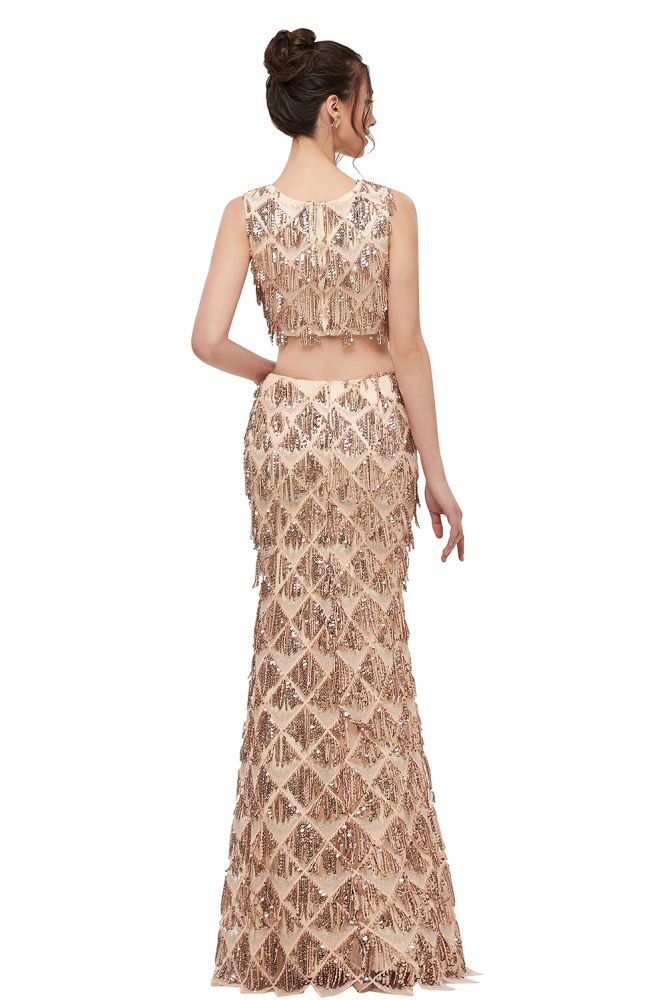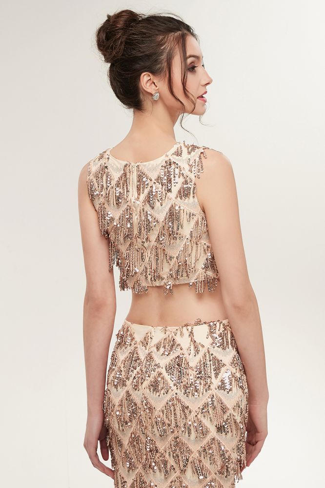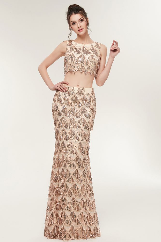 Two-piece Sleeveless Mermaid Floor Length Sequined Champagne Prom Dresses